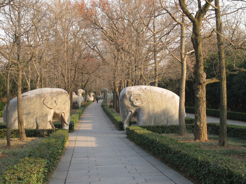 按照正常的入園路線,從四方城開始。四方城內(nèi)巨大的石碑首先給人強(qiáng)烈的視覺沖擊,碑的高度約3層樓房,一個巨型石龜馱負(fù),據(jù)說是目前世界上最大的石碑。幾乎不能想象當(dāng)時是如何把這石碑運(yùn)到山上,又如何樹立起來的?或許借助杠桿和三腳架滑輪之類的工具吧。碑頂云龍紋裝飾,碑文為朱棣手書,吹噓太祖功德。朱棣的楷書非常漂亮,顛覆了我對他的一貫武夫梟雄印象。接下去是約一華里石象路,兩側(cè)排列麒麟、大象、駱駝,獅等雕像,數(shù)量眾多、雕飾寫實(shí)精美。走完石象路,就是翁仲道,道旁分列文官武將,應(yīng)該就是這些將領(lǐng)幕僚輔佐太祖光復(fù)漢人河山的吧!不免讓人產(chǎn)生十分敬重之感,更覺高大古樸!以上是神道部分。