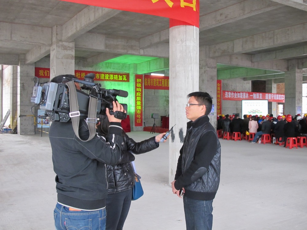 現(xiàn)場會(huì)時(shí),臨海電視臺的記者采訪了市建筑工程質(zhì)量監(jiān)督站站長葉青同志和我公司副總經(jīng)理王國棉同志。葉青同志認(rèn)為東部很多工程項(xiàng)目都是招商引資過來的,大多是外地的建設(shè)單位和施工單位,對我們當(dāng)?shù)匕踩芾硪?guī)定不是很熟悉,以這個(gè)工地為標(biāo)桿,開展樹標(biāo)桿學(xué)標(biāo)桿活動(dòng)旨在提高東部區(qū)塊施工現(xiàn)場的管理水平。王國棉同志著重介紹了該工程安全方面的一些亮點(diǎn),如臨邊防護(hù)、電梯井、洞口防護(hù)都采用定型化、工具化的產(chǎn)品。工程現(xiàn)場布置人性化,特別是在三樓預(yù)埋構(gòu)造柱的鋼筋周邊加了圓形保護(hù)筒,一則防止對鋼筋的破壞,二則安全防護(hù),防止人不小心踩上去。